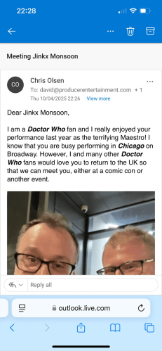 Sutekh and his servants release his dust of death which consumes the Earth and ultimately destroys all life in the universe. Sutekh abhors life and he tells the Doctor, Ruby and Mel that the destruction of all life in the universe satisfies him. Sutekh reveals that he survived the Doctor’s banishment of him at the end of Pyramids of Mars by clinging to the TARDIS in disguise and accompanying him on his adventures ever since. The Doctor vows to stop Sutekh before he, Ruby and Mel escape in a Remembered TARDIS. The Doctor is given a spoon by a kind woman on a distant planet before she disintegrates too. The Doctor realises that the key to saving the universe is to find the identity of Ruby’s biological mother. The Doctor, Ruby and Mel return to Earth so that the Doctor can perform a DNA test on Ruby and find her mother. The scan completes and the name is revealed to Ruby. Mel is revealed to be a dead servant of Sutekh and she brings the Doctor, Ruby and Ruby’s secret to Sutekh. Ruby is about to reveal the secret of her mother to Sutekh, but the Doctor and Ruby spring a trap on the ageless god. The Doctor and Ruby tie Sutekh to the TARDIS and drag him through the time vortex, restoring life to the universe in the process. The Doctor cuts the chord and Sutekh disintegrates in the time vortex. Back on Earth, U.N.I.T identify Ruby’s biological mother from her DNA: a nurse named Louise Miller, who abandoned Ruby at the Church on Ruby Road when she was a teenager. Ruby and her biological mother are reunited in a cafe in an emotional scene. With her family restored, Ruby apparently bids goodbye to the Doctor… but one question still remains, who is Mrs Flood? When I met Anita Dobson last year, I handed her the Doctor Who Season 1 DVD for her to sign and I said “Happy Christmas Ange” to her in a cockney accent, which she loved!