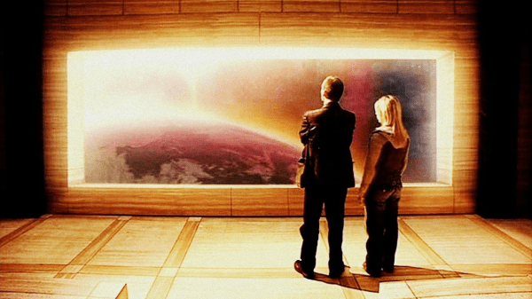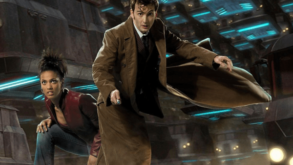 The Tenth Doctor takes his new companion Martha Jones to New Earth in the far future. However, things have changed since the Doctor last visited. Unfortunately, a virus has wiped out most life on the planet. The undercity has been sealed off and many of its citizens are trapped on an endless motorway. Worse still, beneath the gridlocked cassinis are a group of Macra which escaped from New New York Zoo. The Macra are feeding on the exhaust fumes and also the cars themselves. Martha is kidnapped and taken down to the fast lane, which requires three passengers for access. The Doctor follows her where he discovers the dystopian situation on the motorway. Novice Hame finds the Doctor and brings him to the Face of Boe. The Face of Boe saved the undercity when a virus broke out, a result of over-usage of a mood patch called ‘Bliss’. This is an allegory for the AIDS crisis. Hame and Boe help the Doctor to open the motorway up freeing the trapped passengers and Martha. But Boe sacrifices his life in order to do so. In his dying moments, the Face of Boe gives the Doctor his cryptic final secret: “you are not alone”… The Doctor later explains to Martha that he is the last of the Time Lords and that Boe’s message could mean that he may not be the final one after all.